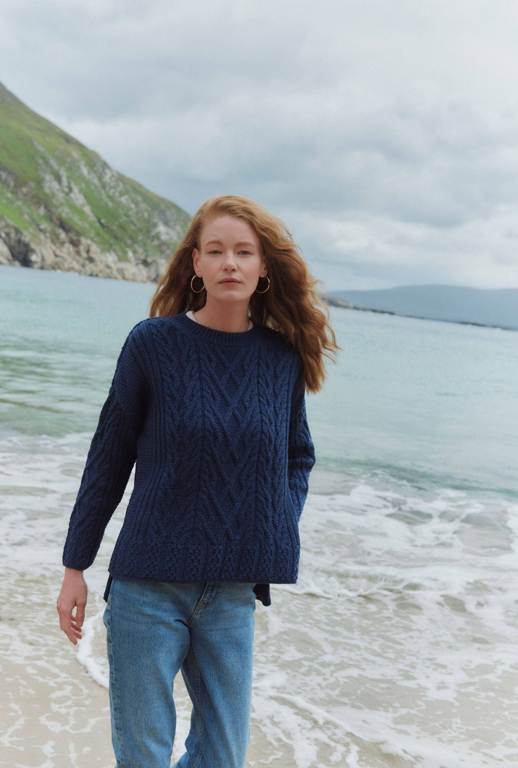 The Aran Tully Box Sweater is a truly modern take on a classic design. With a unique new pattern crafted by the Aran Woollen Mills in-house designer and its on-trend side slits, you can pay homage to the Aran tradition and still remain up to the minute. This Aran sweater has a flattering oversized fit and exhibits a distinct arrangement of classic stitches with a beautifully flattering neckline. Made with our lofty Supersoft Merino wool, you’ll find comfort, luxury and sophistication in the Tully Aran Box Sweater.