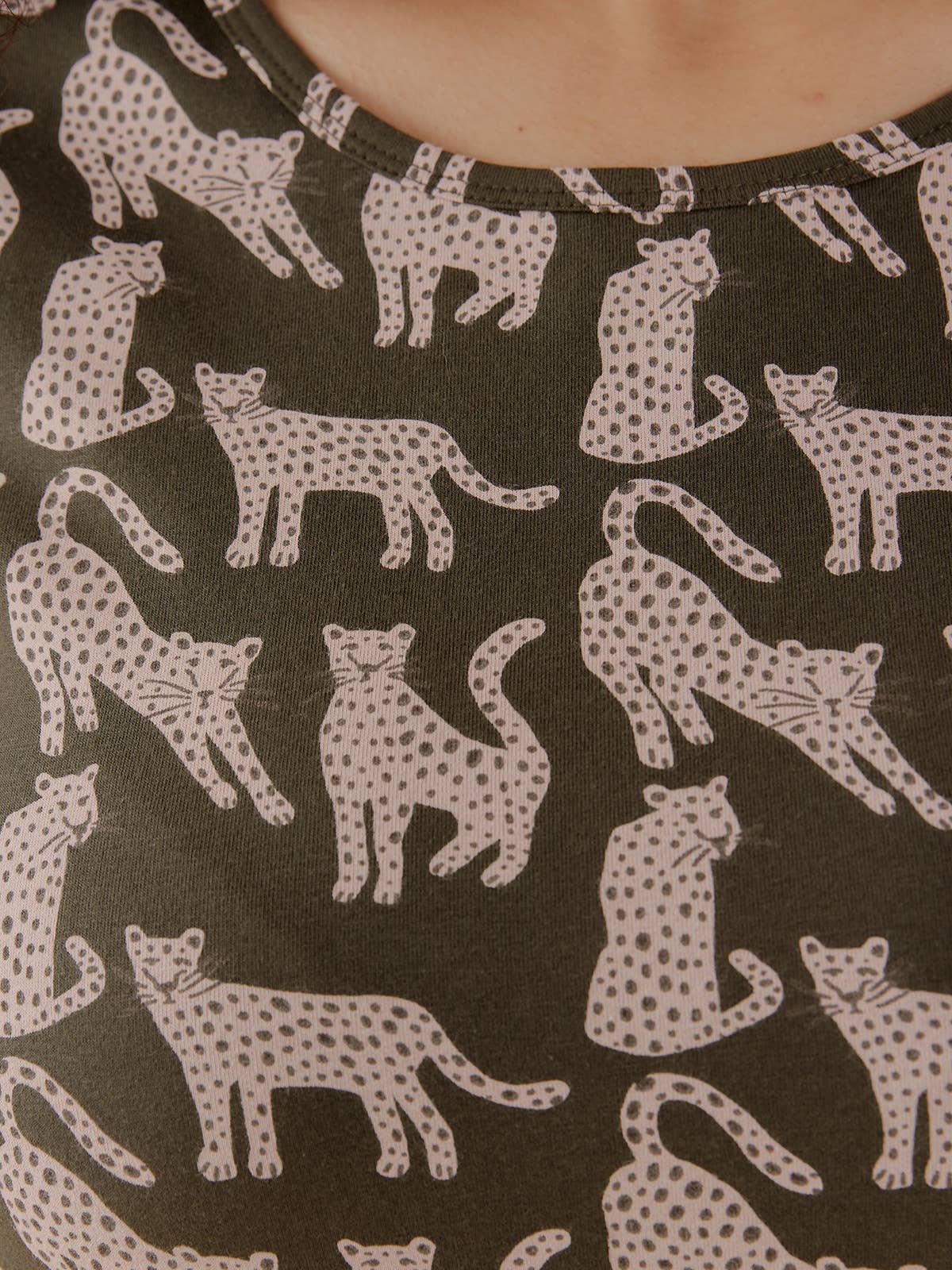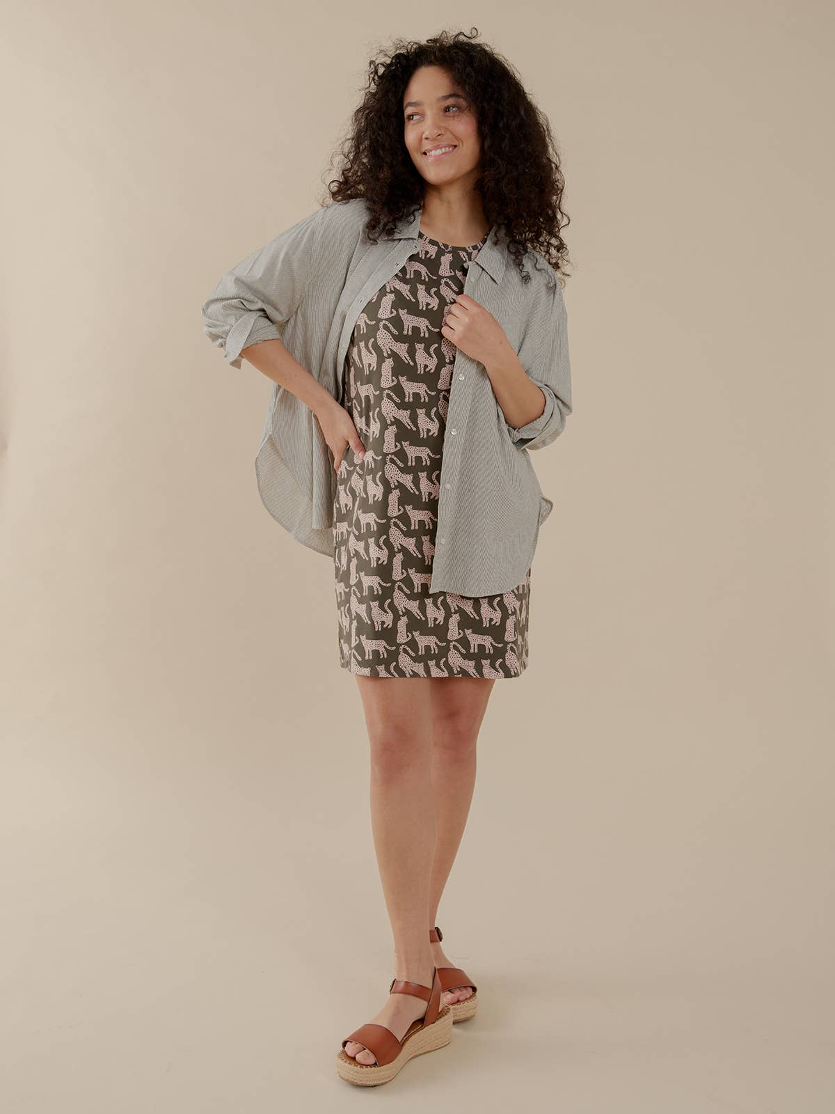 We love the fun pattern of this simple to wear dress.  An easy to wear mod inspired cut that is great for layering.